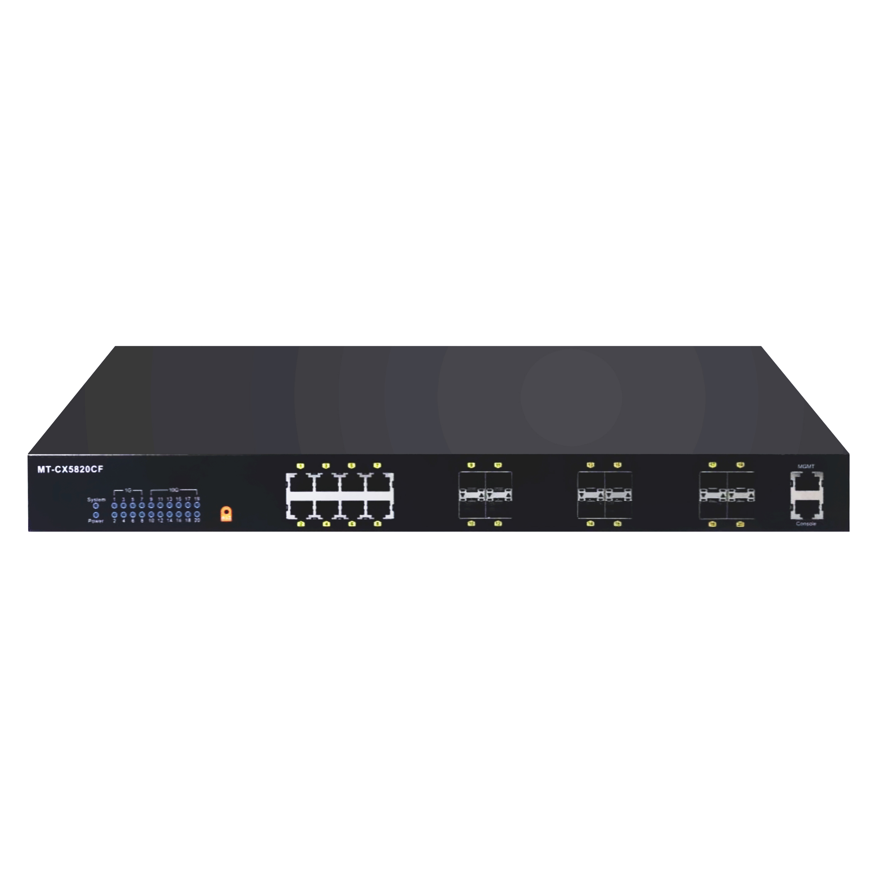 8個(gè) 10/100/1000M RJ-45 MDI/MDI-X 自適應(yīng)端口, 12個(gè)萬兆SFP+端口,1 個(gè) Console 口,1個(gè)管理端口 |